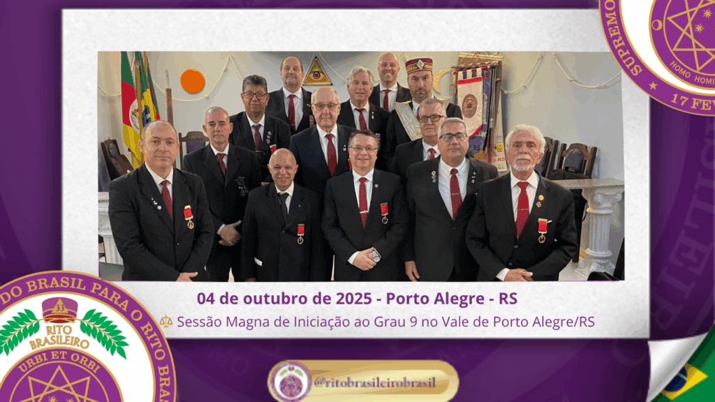 No dia quatro de outubro de dois mil e vinte e cinco, o Supremo Conclave do Brasil para o Rito Brasileiro de Maçons Antigos, Livres e Aceitos, através do Ilustre e Sublime Capítulo Visconde de Mauá nº 77, ao Vale de Porto Alegre – RS, realizou uma Sessão Magna de Iniciação ao Grau 9 – Mestre da Justiça, marco importante na hierarquia dos Altos Graus do Rito Brasileiro.