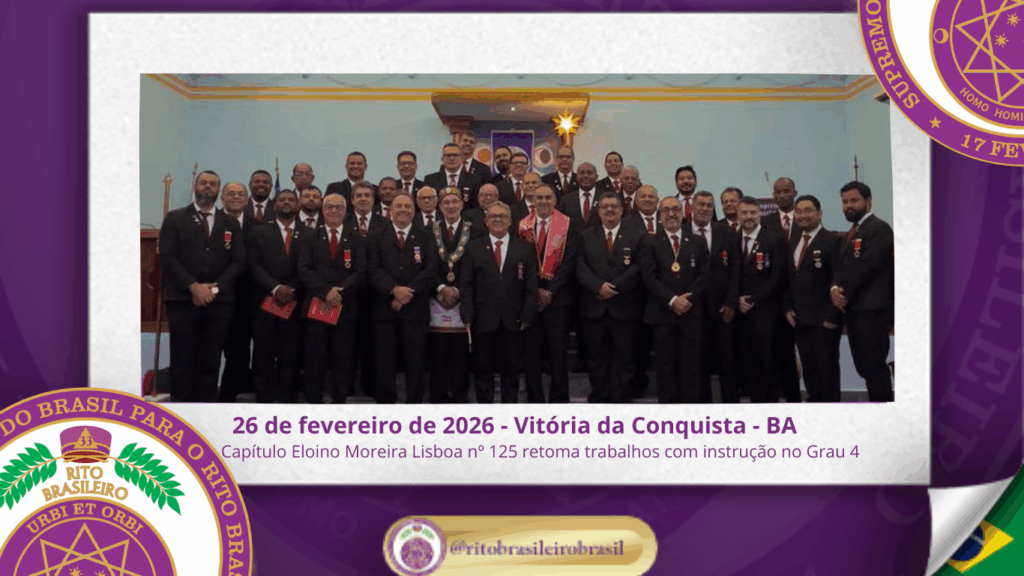 No dia 26 de fevereiro de 2026, o Ilustre e Sublime Capítulo Eloino Moreira Lisboa nº 125, ao Vale de Vitória da Conquista/BA, retomou suas atividades com a realização de Sessão de Instrução no Grau 4 – Mestre da Discrição, marcando o reinício dos trabalhos filosóficos com elevado espírito de estudo e união.