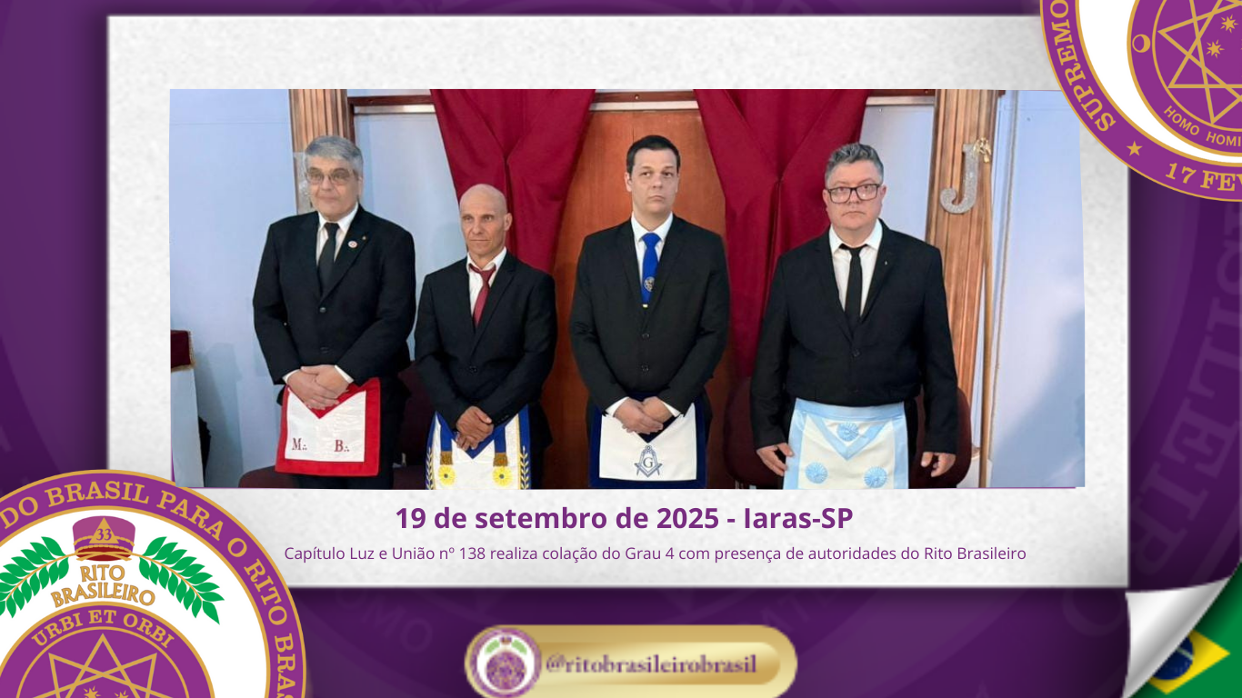 No dia dezenove de setembro de dois mil e vinte e cinco, o Ilustre e Sublime Capítulo Luz e União nº 138, ao Vale de Iaras-SP, realizou uma memorável Sessão Magna de Colação do Grau 4 – Mestre da Discrição, marcando o ingresso nos Altos Graus do Rito Brasileiro de Maçons Antigos, Livres e Aceitos de quatro novos obreiros.