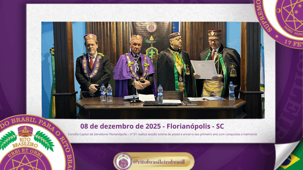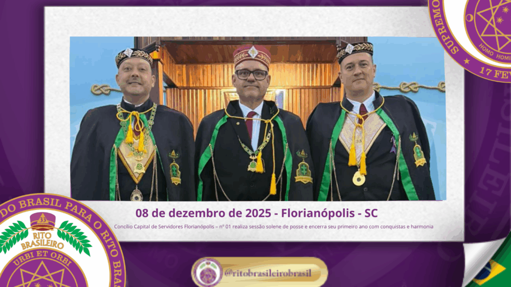 Instalado pelo Decreto nº 311, de 2 de outubro de 2024, o Concílio Capital de Servidores Florianópolis – nº 01 completou seu primeiro ano de atividades ao Vale de Florianópolis com saldo extremamente positivo. A sessão solene foi marcada pelo cerimonial de posse do novo Presidente, Eminente Irmão Itiberê Cornelius Ewerling, e do novo Grande Secretário, Eminente Irmão Roger Andrade dos Santos, que conduzirão os trabalhos do Alto Corpo no ano de dois mil e vinte e seis.