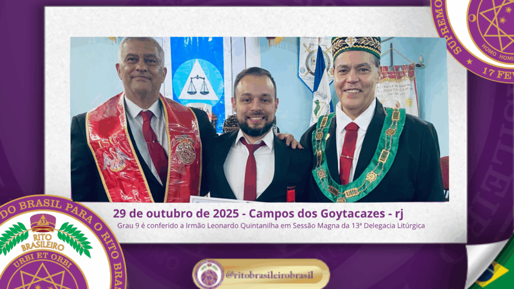 No dia vinte e nove de outubro de dois mil e vinte e cinco, ao Clima de Campos dos Goytacazes-RJ, foi realizada no O Ilustre e Sublime Capítulo Bernardino Maria Filho nº 109, a Sessão Magna de Iniciação ao Grau 9 – Mestre da Justiça do Ilustre Irmão Leonardo Quintanilha, reafirmando a força do Rito Brasileiro e da atuação da 13ª Delegacia Litúrgica do Estado do Rio de Janeiro.