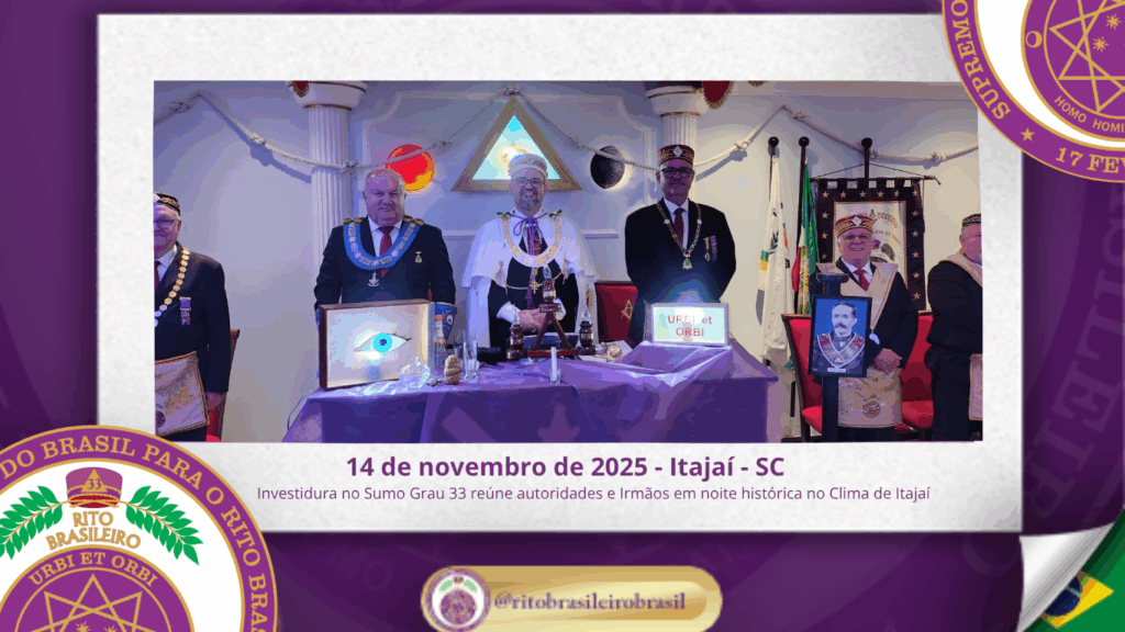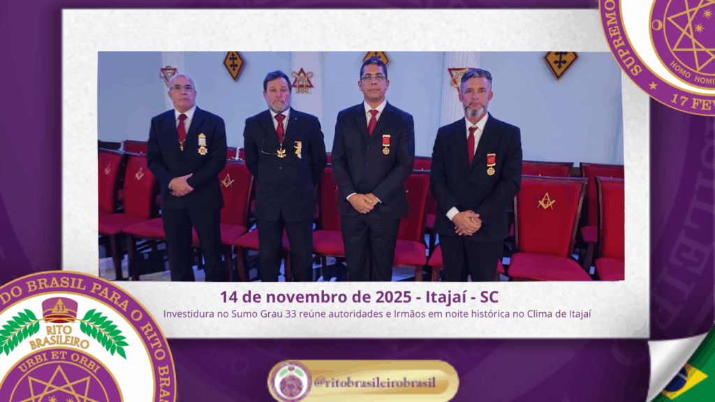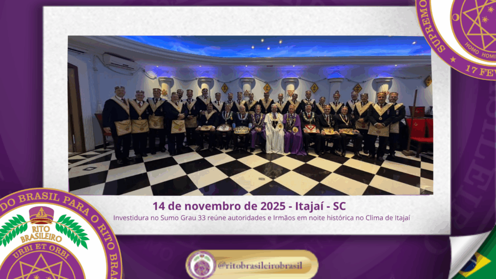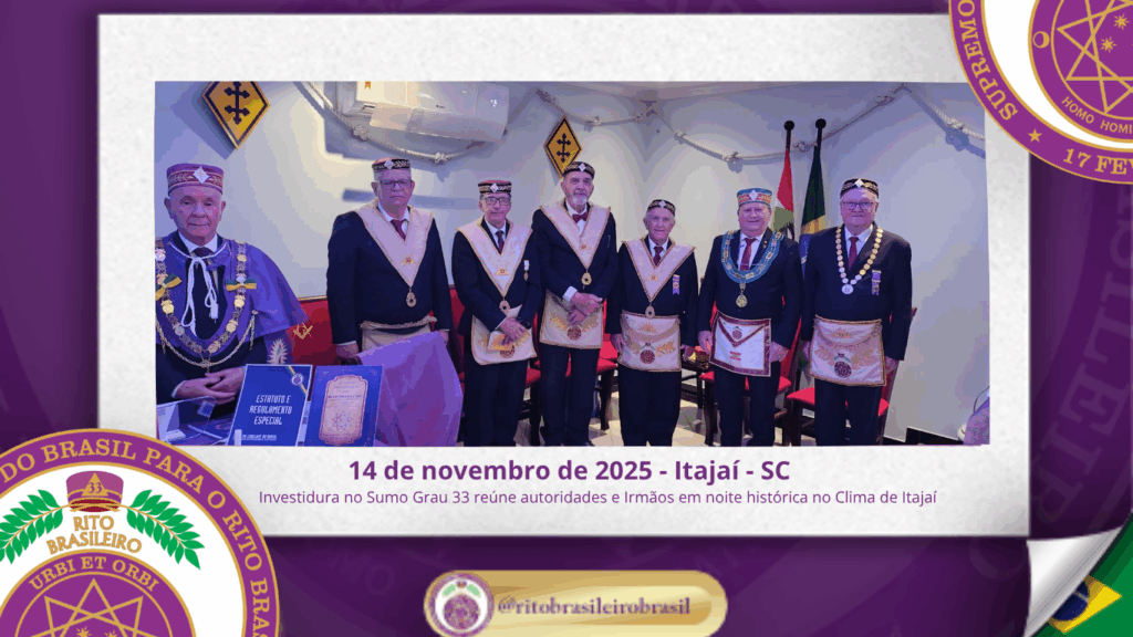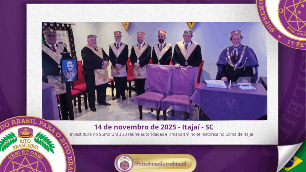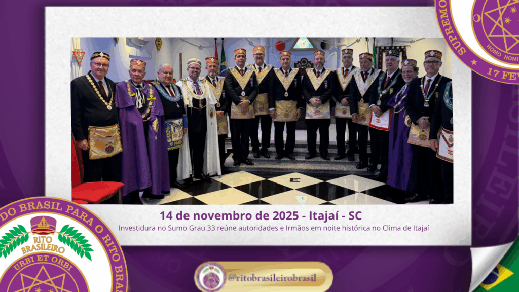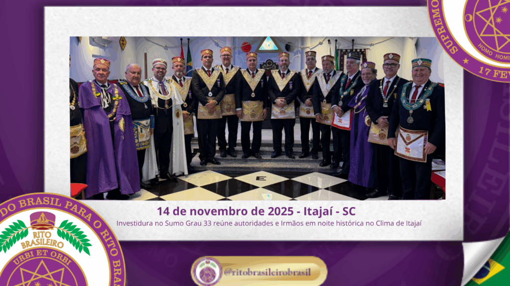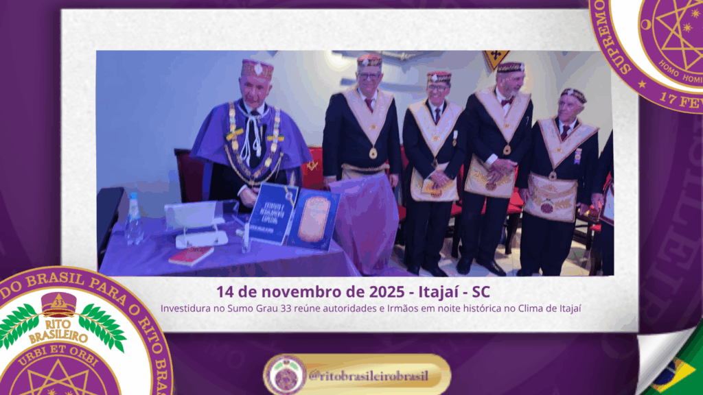 No dia quatorze de novembro de dois mil e vinte e cinco, ao Clima de Itajaí, Estado de Santa Catarina, na sede da 2ª Delegacia Litúrgica do Rito Brasileiro, foi realizada uma magna cerimônia de investidura no Sumo Grau 33 – Servidor da Ordem, da Pátria e da Humanidade, com a presença de distintas autoridades maçônicas do Rito Brasileiro.