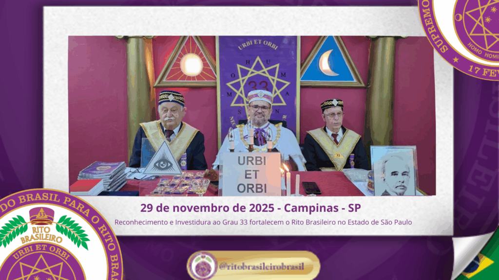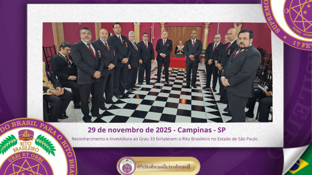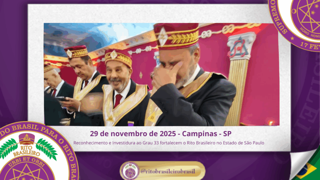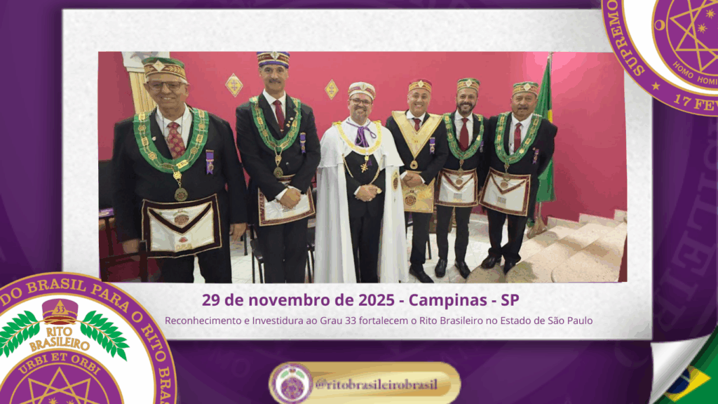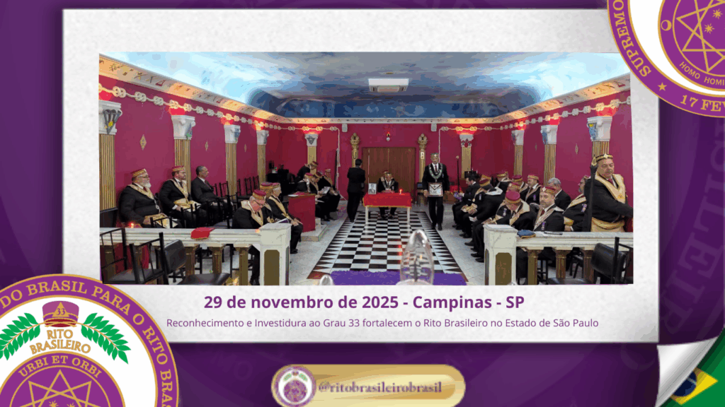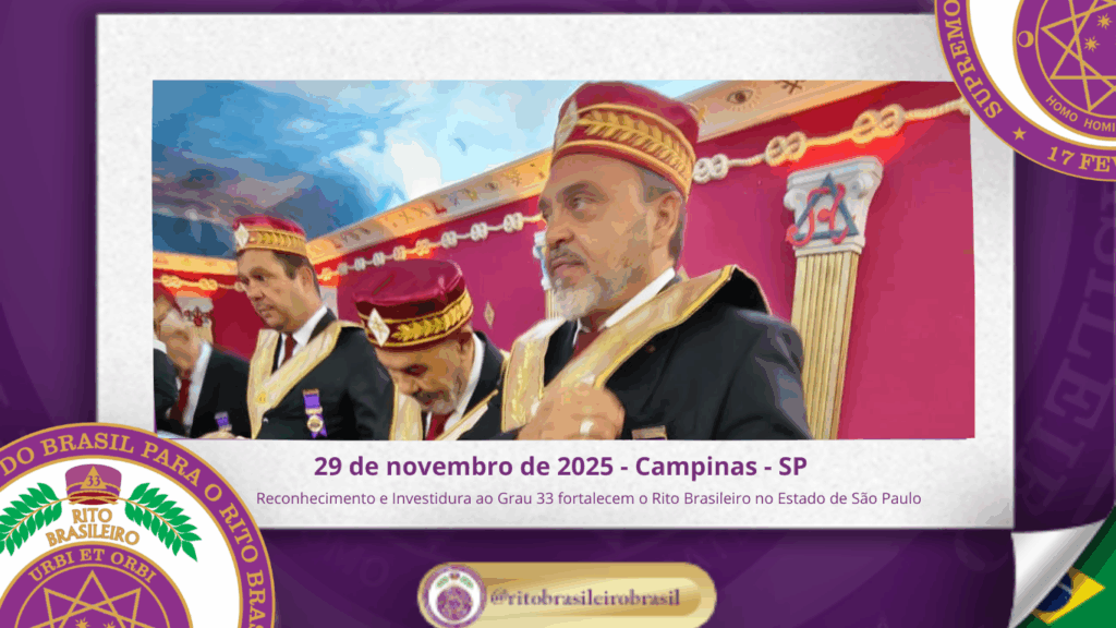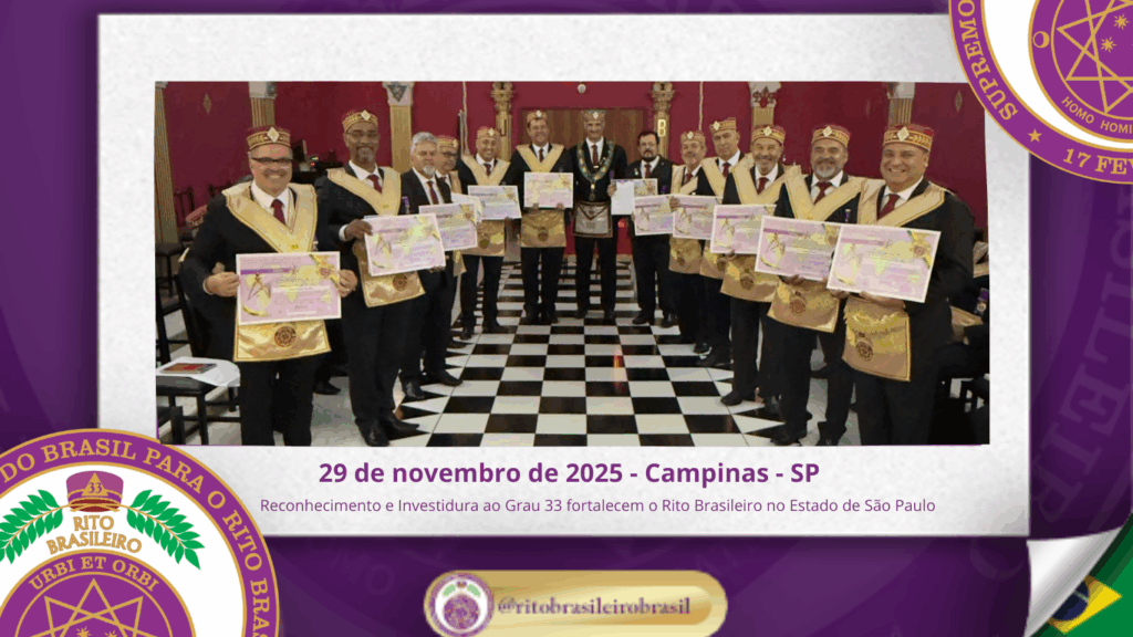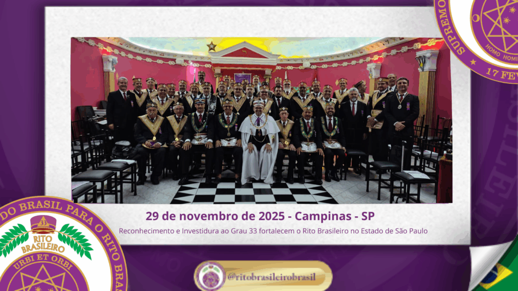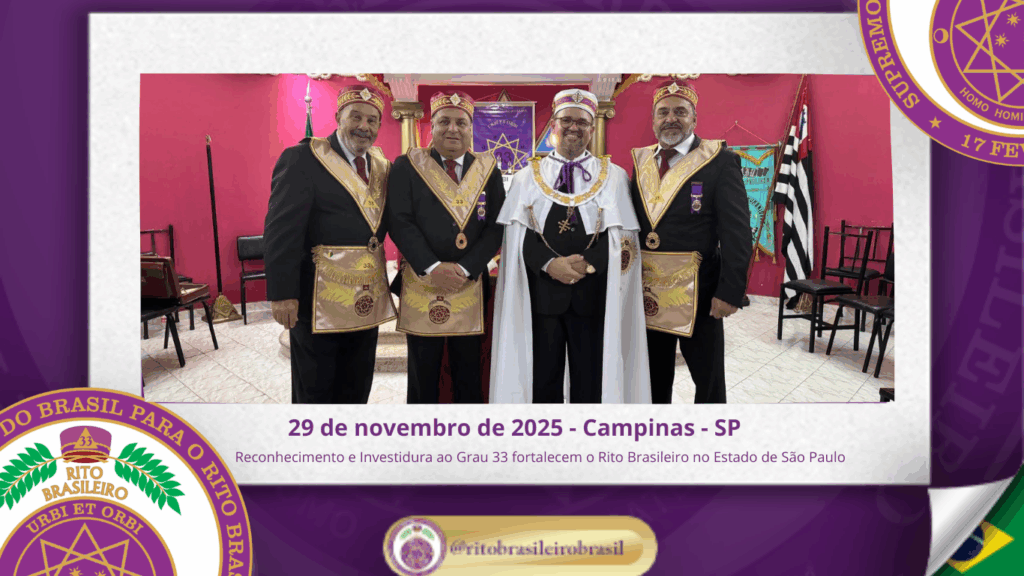 No dia vinte e nove de novembro do ano de dois mil e vinte e cinco, o Supremo Conclave do Brasil para o Rito Brasileiro de Maçons Antigos, Livres e Aceitos realizou, ao Clima de Campinas/SP, uma significativa Sessão de Investidura e Reconhecimento do Sumo Grau 33 – Servidor da Ordem, da Pátria e da Humanidade, reafirmando o fortalecimento do Rito no Estado de São Paulo.