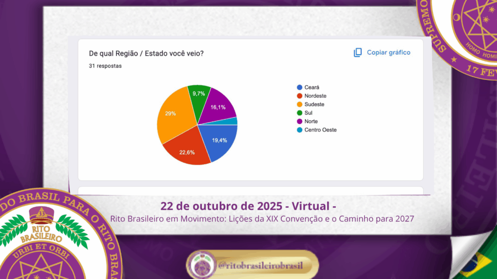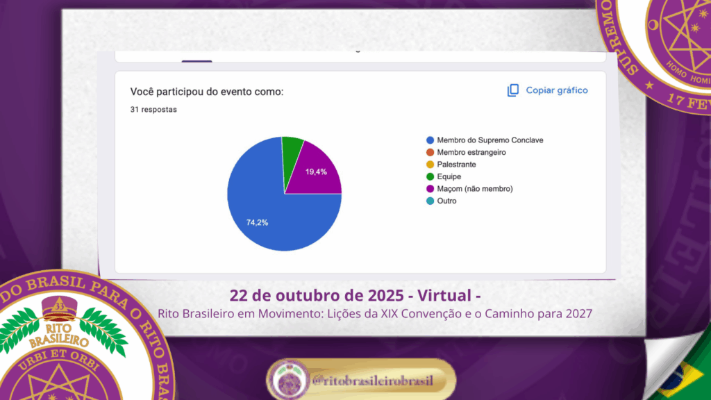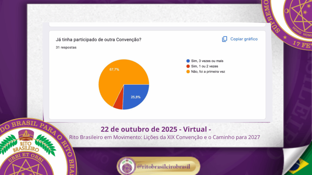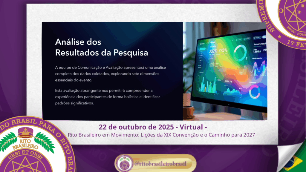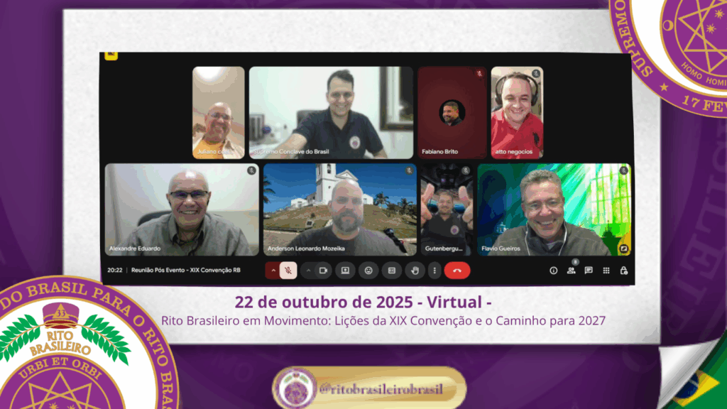 No dia 22 de outubro de 2025, o Supremo Conclave do Brasil promoveu, de forma virtual, a reunião oficial de avaliação da XIX Convenção Nacional do Rito Brasileiro. Com espírito de responsabilidade e fraternidade, o encontro reuniu membros da administração do Supremo, Delegados Litúrgicos e servidores da Ordem para refletir sobre os aprendizados vividos ao Clima de Fortaleza e dar os primeiros passos rumo à XX Convenção, que será realizada em Caldas Novas – GO, em 2027.