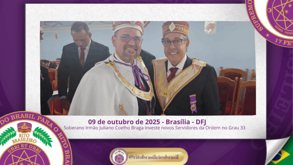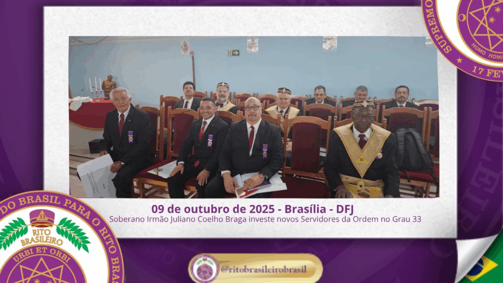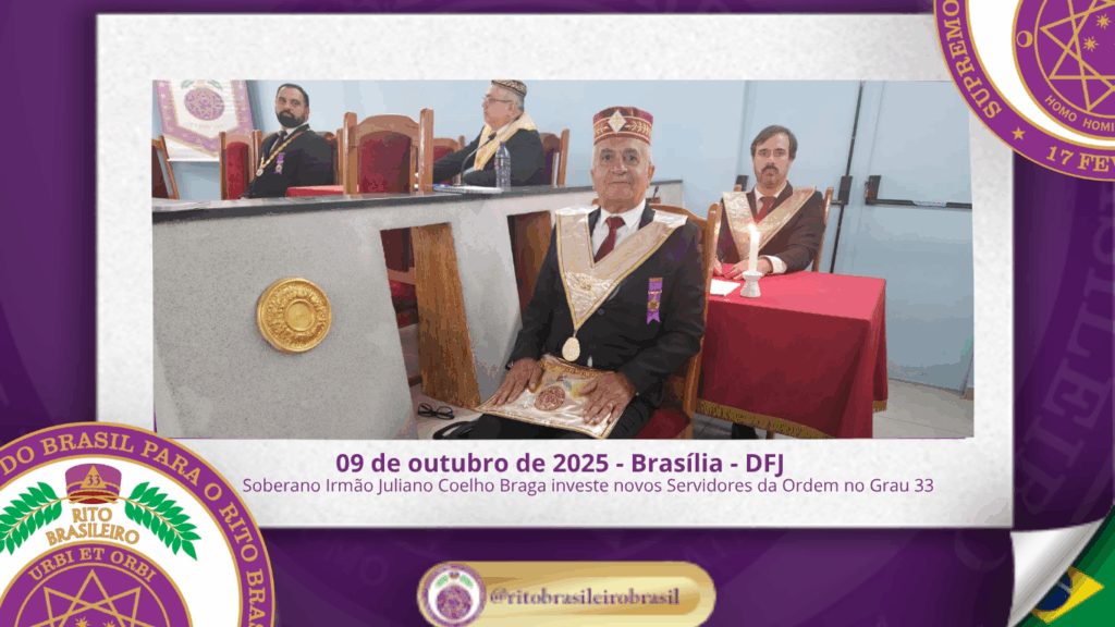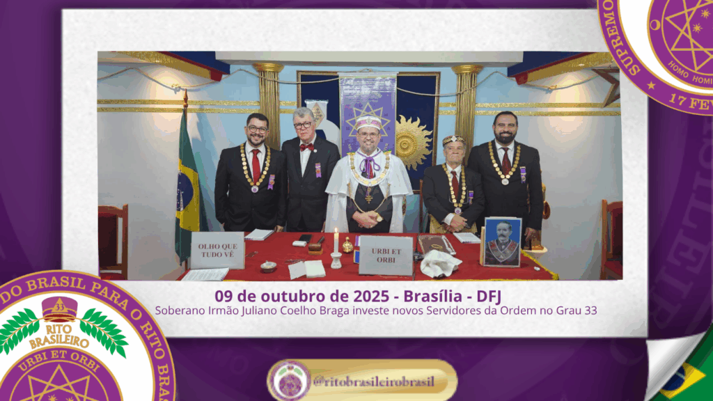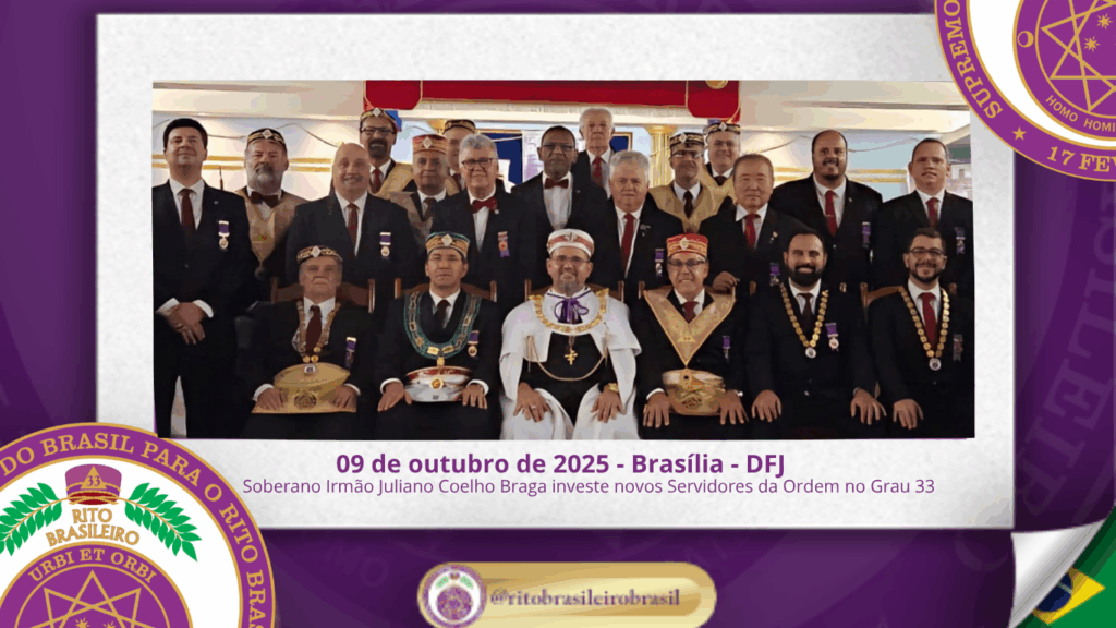 No dia nove de outubro de dois mil e vinte e cinco, no Templo do Rito Brasileiro situado no Palácio Maçônico do Grande Oriente do Distrito Federal, ao Clima de Brasília, foi realizada mais uma Sessão Magna de Investidura no Sumo Grau 33 – Servidor da Ordem, da Pátria e da Humanidade, promovida pelo Supremo Conclave do Brasil.