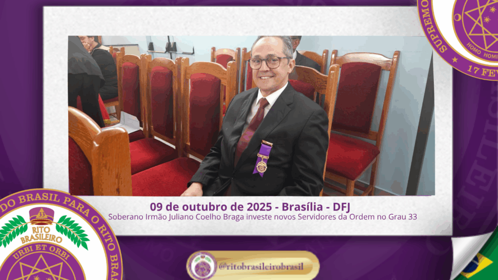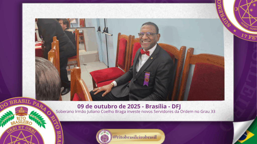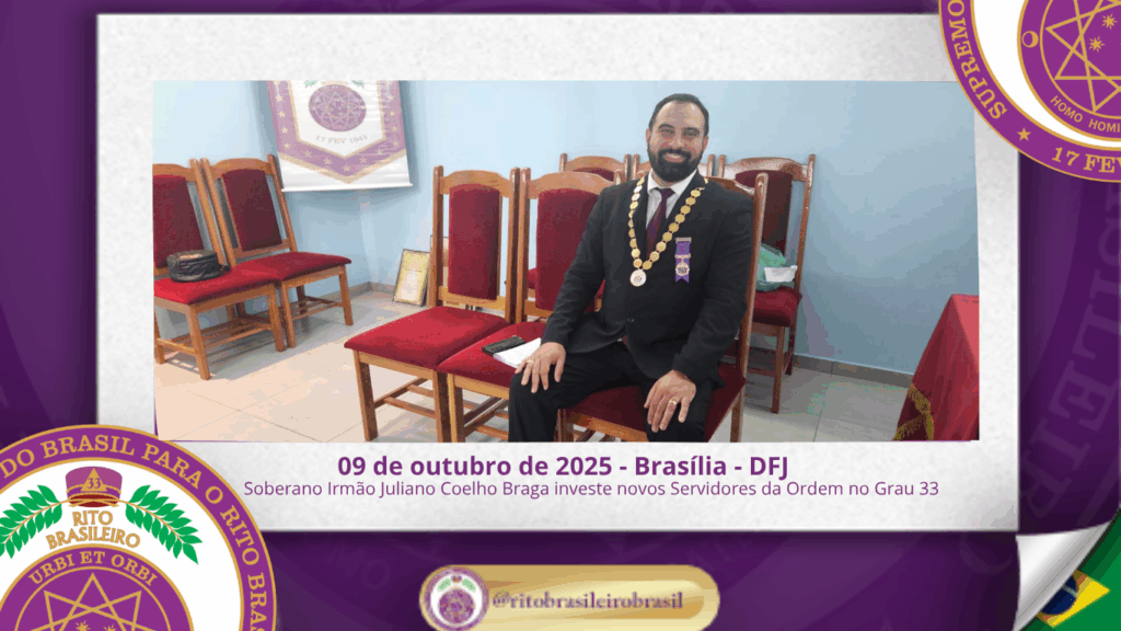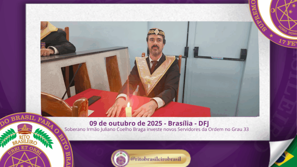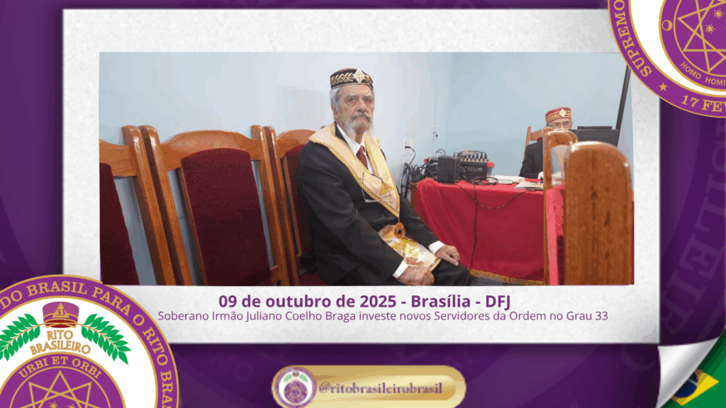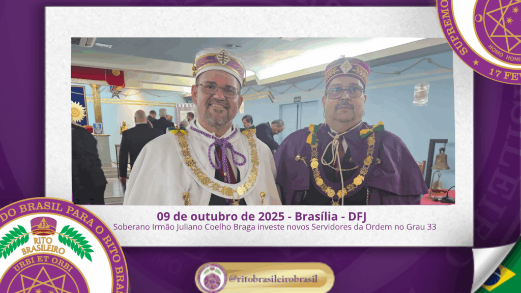 No dia nove de outubro de dois mil e vinte e cinco, no Templo do Rito Brasileiro situado no Palácio Maçônico do Grande Oriente do Distrito Federal, ao Clima de Brasília, foi realizada mais uma Sessão Magna de Investidura no Sumo Grau 33 – Servidor da Ordem, da Pátria e da Humanidade, promovida pelo Supremo Conclave do Brasil.
