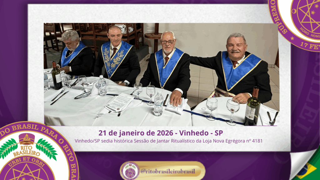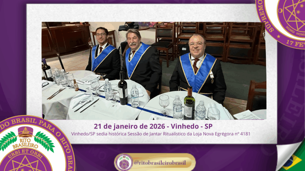 No dia vinte e um de janeiro do ano de dois mil e vinte e seis, no Oriente de Vinhedo/SP, a Augusta e Respeitável Loja Simbólica Nova Egrégora nº 4181 realizou sua primeira Sessão Magna de Jantar Ritualístico, conduzida com excelência sob os preceitos do Rito Brasileiro de Maçons Antigos, Livres e Aceitos, fortalecendo os laços fraternais e a vivência ritual no Estado de São Paulo.